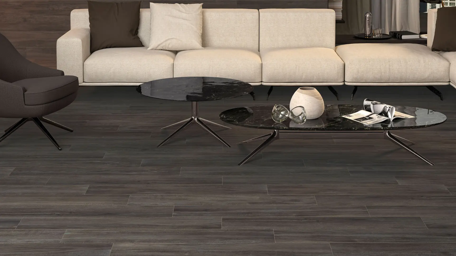 Su diseño es una madera walnut de contraste gráfico estilizado, con ausencia de vetas marcadas o nudos de alto contraste logrando un ligero movimiento, en color Gray, Natural y Brown. Se recomienda para aplicación residencial, interior y exterior, mientras que en espacios comerciales para tráfico ligero, ideal para instalación Piso y Muro.
