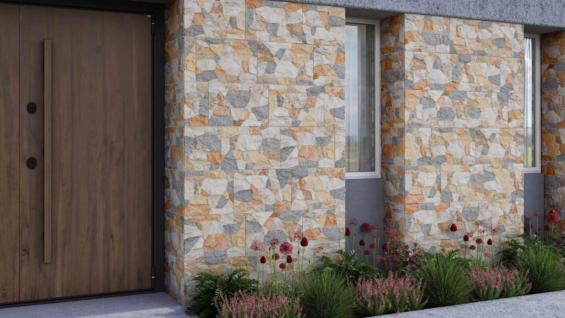 La tendencia de Fachadas en Piedras gira en torno a la creación de formas voluminosas que se adapta tomando diseños inusuales o geométricos así como imponentes, por su composición de color se hacen únicos para embellecer el diseño exterior. La serie se conforma por 2 colores, Multicolor y Latte.
